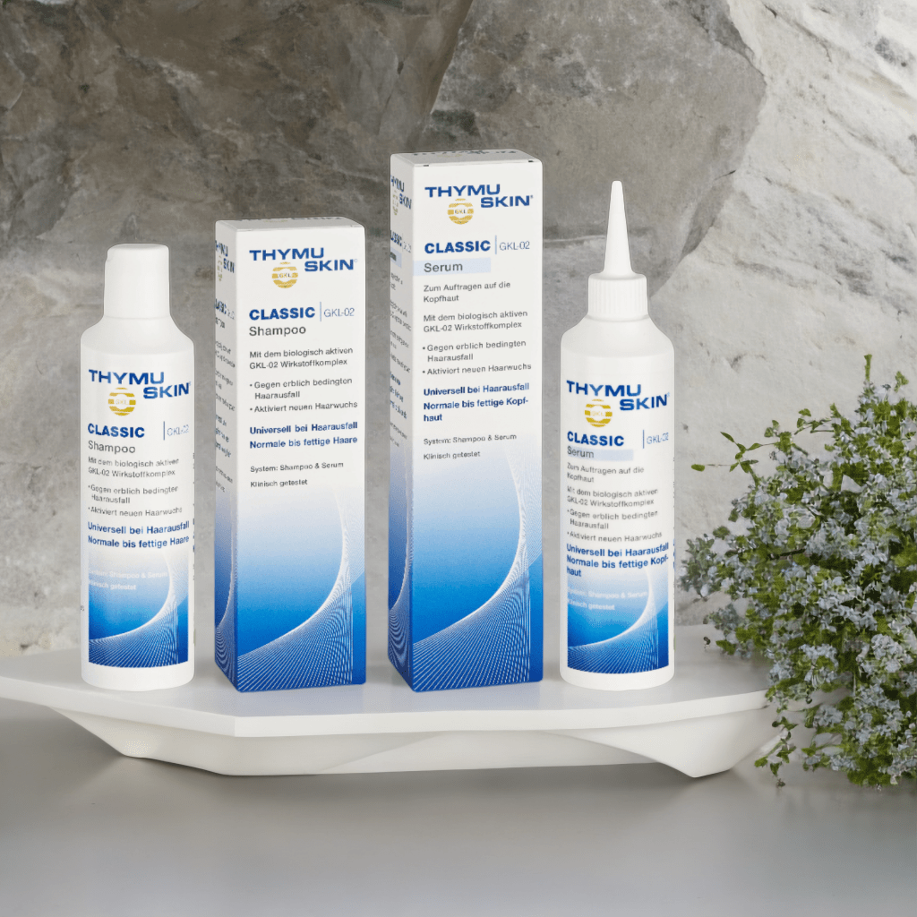 Δημιουργήσαμε το Πακέτο THYMUSKIN CLASSIC για να προσφέρουμε μια ολοκληρωμένη θεραπεία 2 βημάτων. Η φόρμουλα στοχεύει στην αποτελεσματική αναστολή της τριχόπτωσης. Επιπλέον, ενισχύει την πυκνότητα των μαλλιών. Αυτό βελτιώνει τη συνολική τους υγεία.